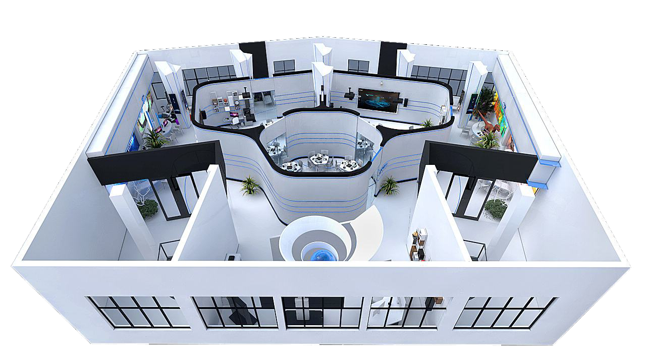 通过空间设备变化,拉近师生距离,促进互动交流多边形教室,常规讲桌或中央讲桌,不同方位8台触控 式交互大屏 集中授课时清晰看到教学内容,分组研讨、各组学生单独演示